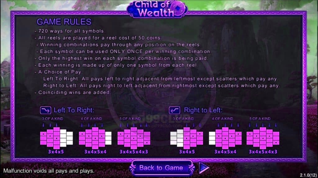 - ขวาไปซ้าย : รางวัลทั้งหมดจ่ายจากขวาไปซ้ายที่ติดกันโดยเริ่มจากขวาสุดยกเว้นสัญลักษณ์กระจายทุกตำแหน่ง