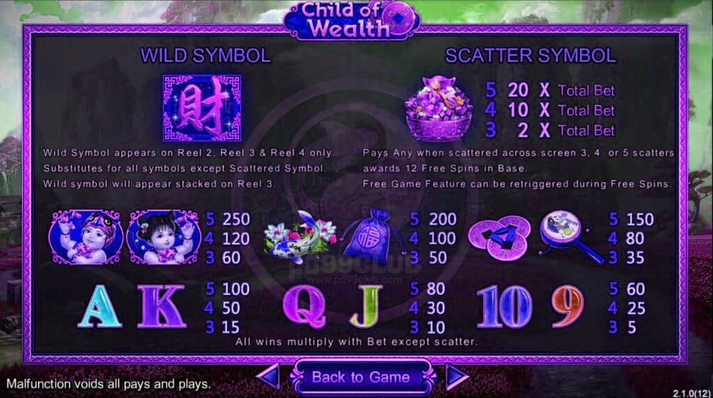 - สัญลักษณ์จะจ่ายทุกกรณีเมื่อมีกระจายปรากฏบนหน้าจอกระจาย 3 , 4 หรือ 5 ตัวจะให้ 12 ฟรีสปินในเกมพื้นฐาน