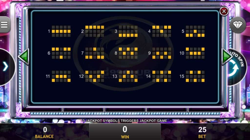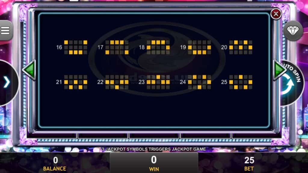สัญลักษณ์ Jackpot Game 3 ตัวที่ปรากฏบนรีล 1,3 และ 5 จะทำให้เกมแจ็คพอตขึ้น ผู้เล่นจะมีโอกาสชนะรางวัลเป็นจำนวนเงินที่แสดงในแผนภูมิโปรเกรสซีฟแจ็คพอต