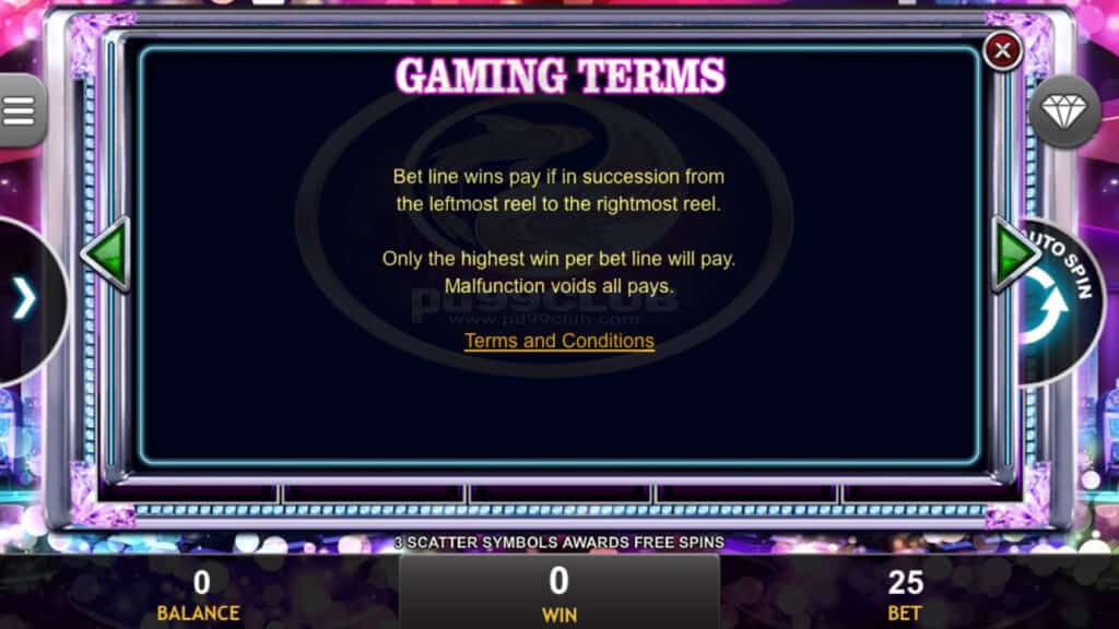 เงื่อนไขการเล่นเกมสายการเดิมพันชนะการจ่ายเงินหากต่อเนื่องกันจากรีลซ้ายสุดไปยังรีลขวาสุด เฉพาะการชนะสูงสุดต่อบรรทัดการเดิมพันเท่านั้นที่จะทำงานผิดพลาดเป็นโมฆะการจ่ายเงินทั้งหมด