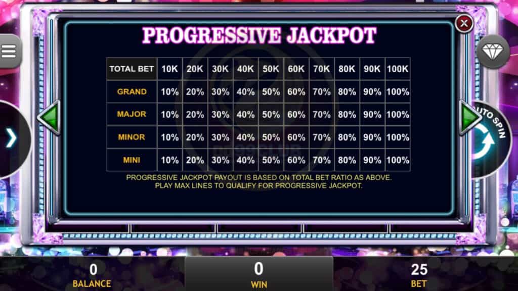 สัญลักษณ์ Progressive Jackpot การจ่ายเงินแจ็คพอตแบบก้าวหน้าขึ้นอยู่กับอัตราส่วนการเดิมพันทั้งหมดที่กล่าวมา เล่น MAX LINES เพื่อคุณสมบัติสำหรับแจ็คพอตที่ก้าวหน้า