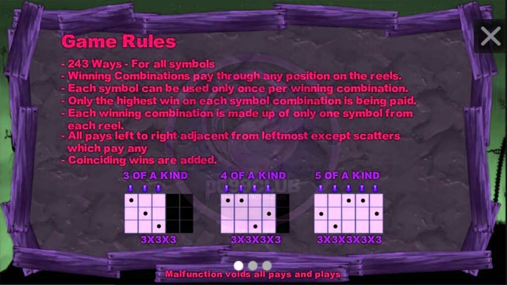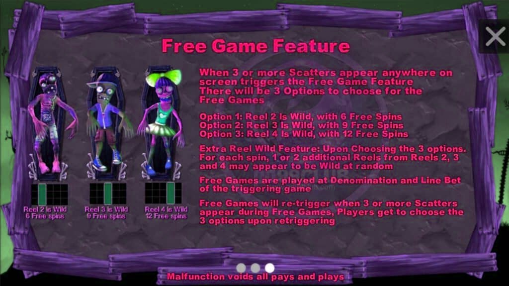 - เมื่อมีสัญลักษณ์กระจาย 3 ตัวปรากฏบนที่ใดๆ ของหน้าจอจะได้ฟีเจอร์ฟรีเกม