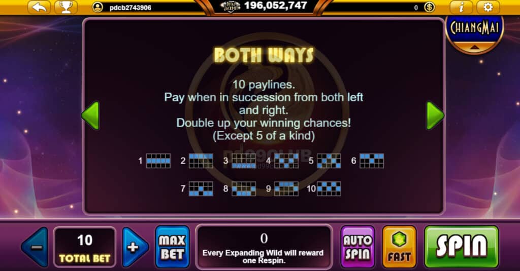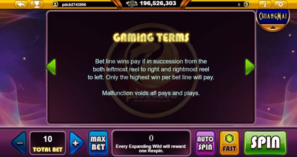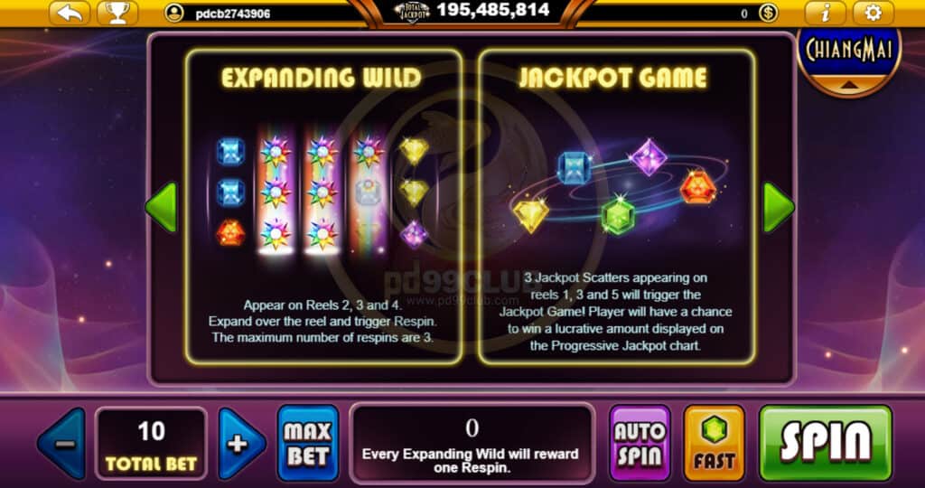 สัญลักษณ์ EXPANDING WILD ทดแทนสัญลักษณ์ทั้งหมดยกเว้นสัญลักษณ์ Jackpot Scatter