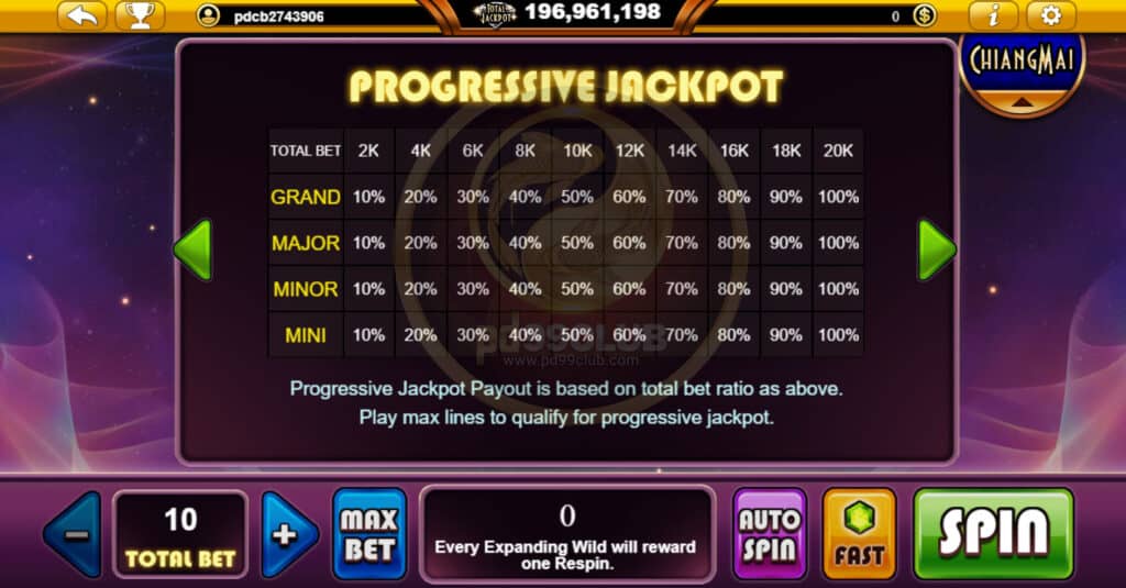สัญลักษณ์ Progressive Jackpot จะสามารถเพิ่มจำนวนเงินไปยังเเจ็คพอตทุกครั้งที่มีการวางเดิมพันการจ่ายเงินจะขึ้นอยู่กับอัตราเดิมพันทั้งหมดข้างต้น เล่นไลน์เดิมพันสูงสุดดังนั้นผู้เล่นจำเป็นต้องวางเดิมพันสูงสุดเพื่อให้พวกเขามีสิทธิ์ที่จะชนะ รางวัลเเจ็คพอตสะสม