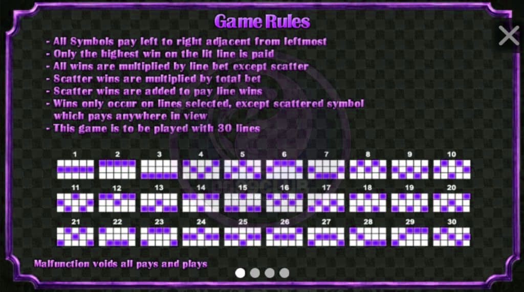 - รางวัลจะได้รับเฉพาะจากแถวที่เลือกไว้ยกเว้นสัญลักษณ์กระจายจะจ่ายรางวัลไม่ว่าจะอยู่ที่ใดบนหน้าจอ