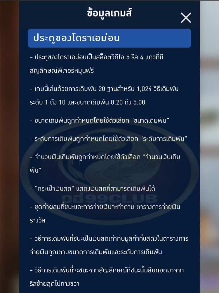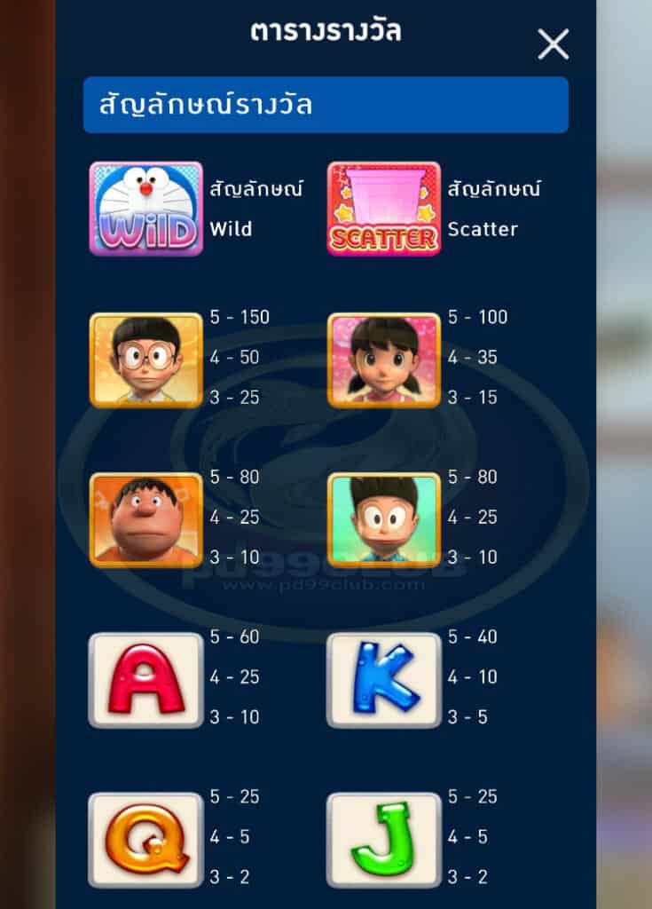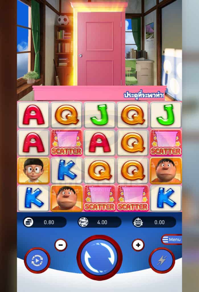 - ประตูของโดราเอม่อนเป็นสล็อตวิดีโอ 5 รีล 4 แถวที่มีสัญลักษณ์ฟีเจอร์หมุนฟรี