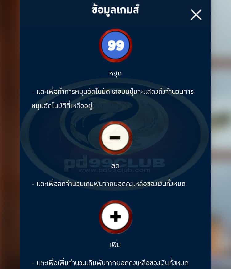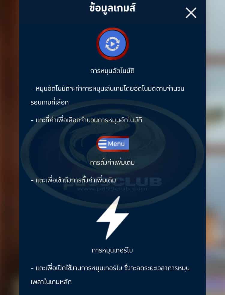 - หมุนอัตโนมัติจะทำการหมุนเล่นเกมโดยอัตโนมัติตามจำนวนรอบเกมที่เลือก