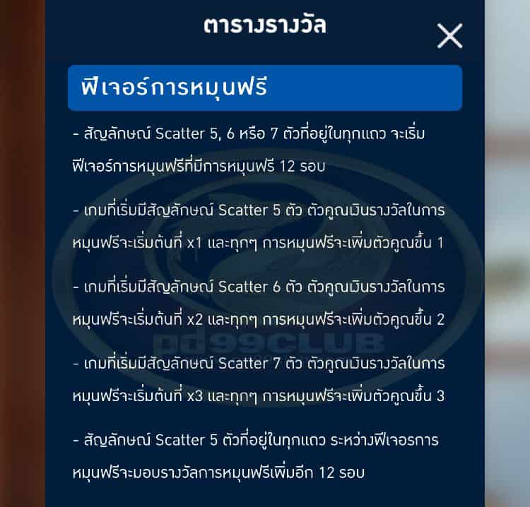 - เกมที่เริ่มมีสัญลักษณ์ Scatter 7 ตัวตัวคูณเงินรางวัลในการหมุนฟรีจะเริ่มต้นที่ x3 และทุกๆการหมุนฟรีจะเพิ่มตัวคูณขึ้น 3