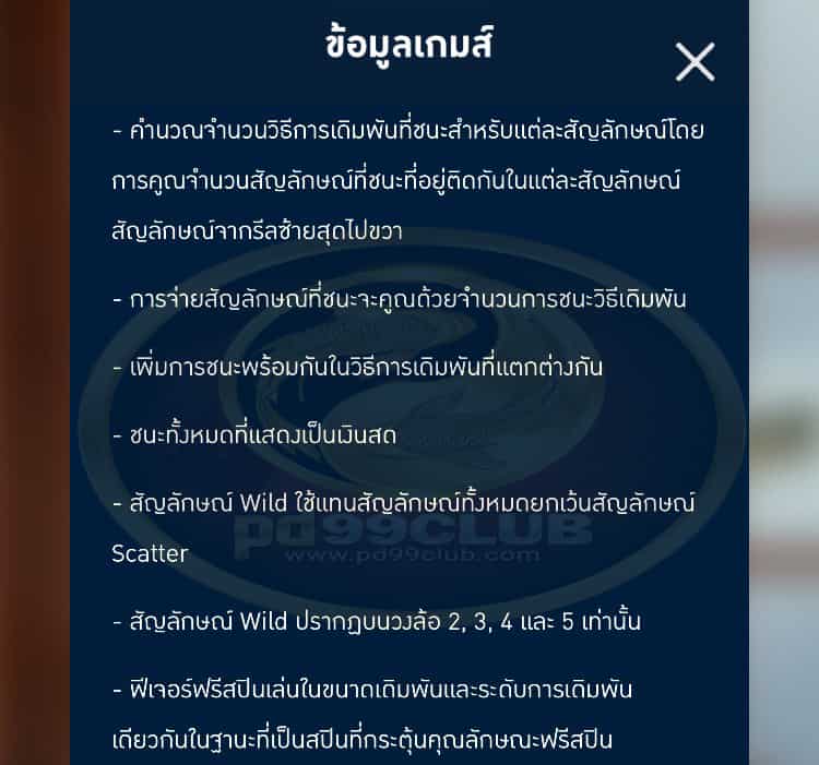 - สัญลักษณ์ Wild ใช้แทนสัญลักษณ์ทั้งหมดยกเว้นสัญลักษณ์ Scatter