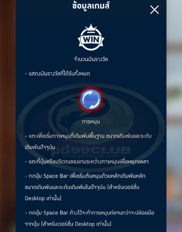 - กดปุ่ม Space Bar เพื่อเริ่มต้นหมุนด้วยหลักเดิมพันหลักขนาดเดิมพันและระดับเดิมพันในปัจจุบัน (สำหรับเวอร์ชั่น Desktop เท่านั้น)