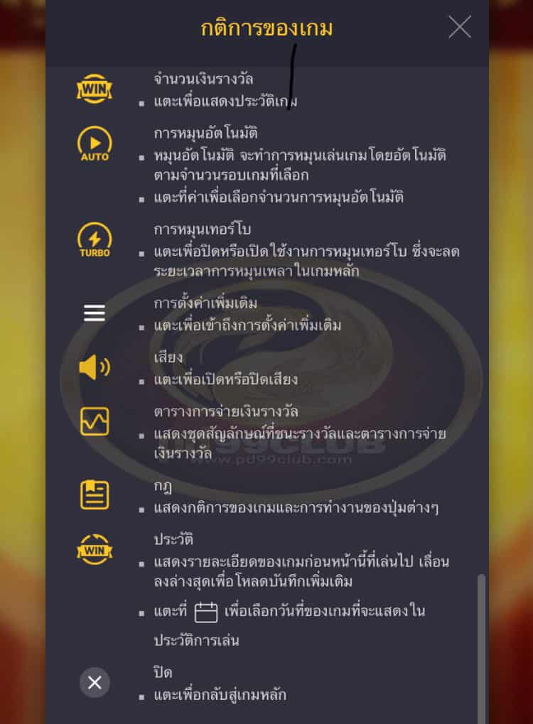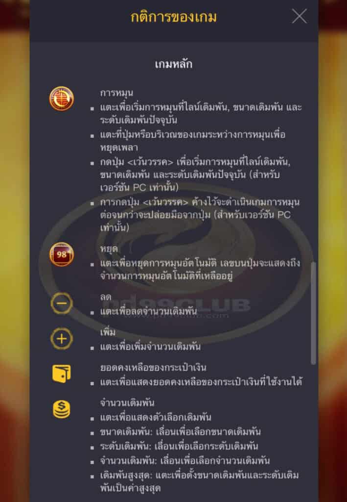 - หมุนอัตโนมัติจะทำการหมุนเล่นเกมโดยอัตโนมัติตามจำนวนรอบเกมที่เลือก