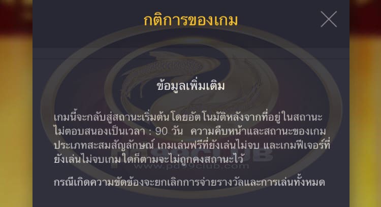 - เกมนี้จะกลับสู่สถานะเริ่มต้นโดยอัตโนมัติหลังจากที่อยู่ในสถานะไม่ตอบสนองเป็นเวลา: 90 วันความคืบหน้าและสถานะของเกมประเภทสะสมสัญลักษณ์เกมเล่นฟรีที่ยังเล่นไม่จบและเกมฟีเจอร์ที่ยังเล่นไม่จบเกมใดก็ตามจะไม่ถูกคงสถานะไว้