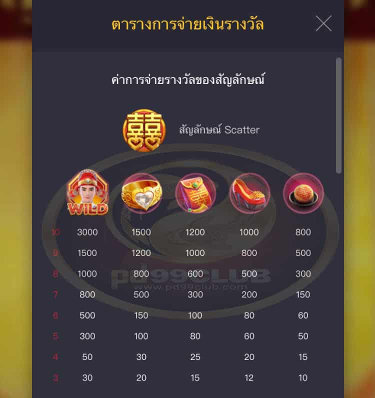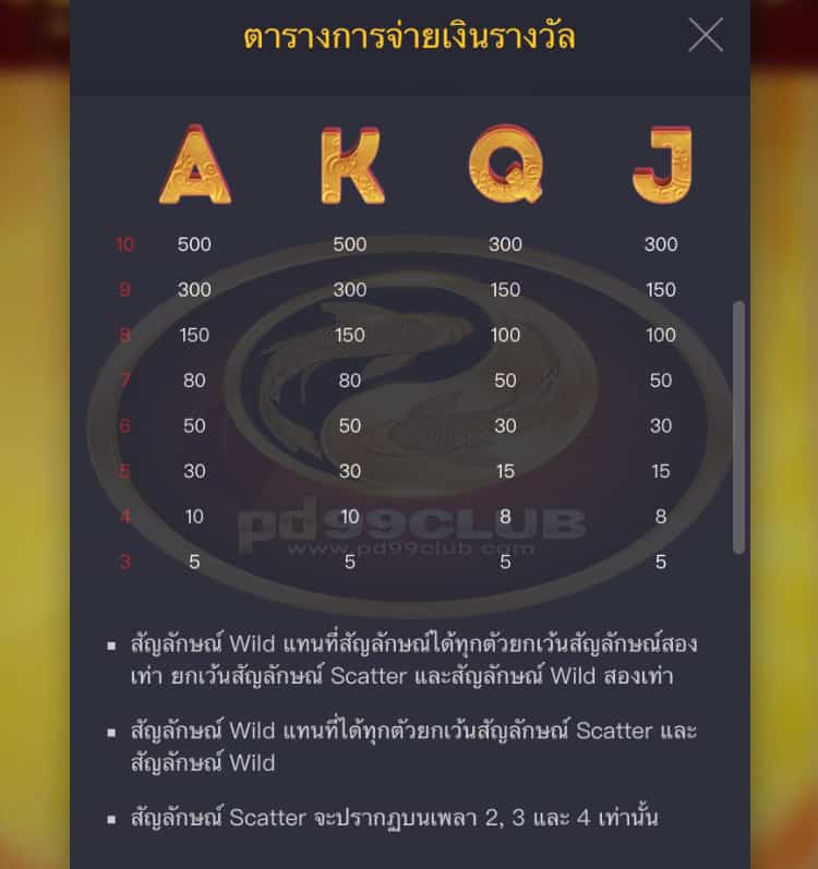 - ค่าการจ่ายรางวัลของสัญลักษณ์มีทั้งหมด 10 สัญลักษณ์