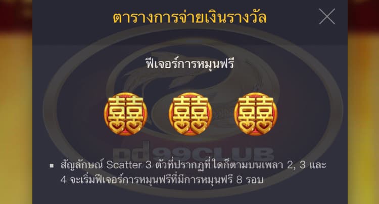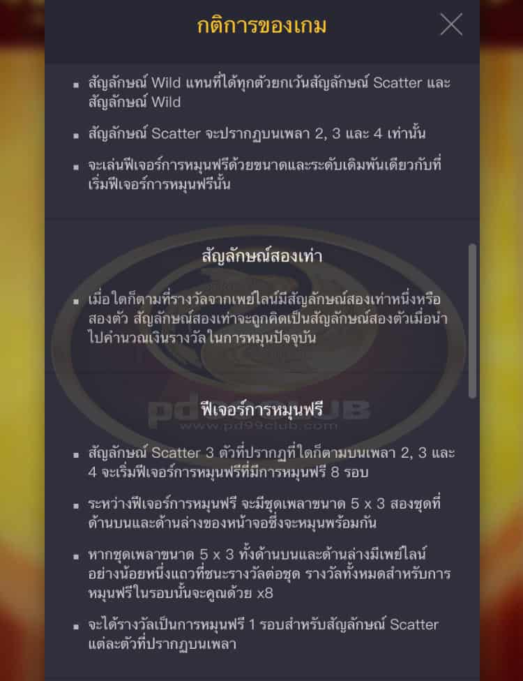 - จะเล่นฟีเจอร์การหมุนฟรีด้วยขนาดและระดับเดิมพันเดียวกับที่เริ่มฟีเจอร์การหมุนฟรีนั้น