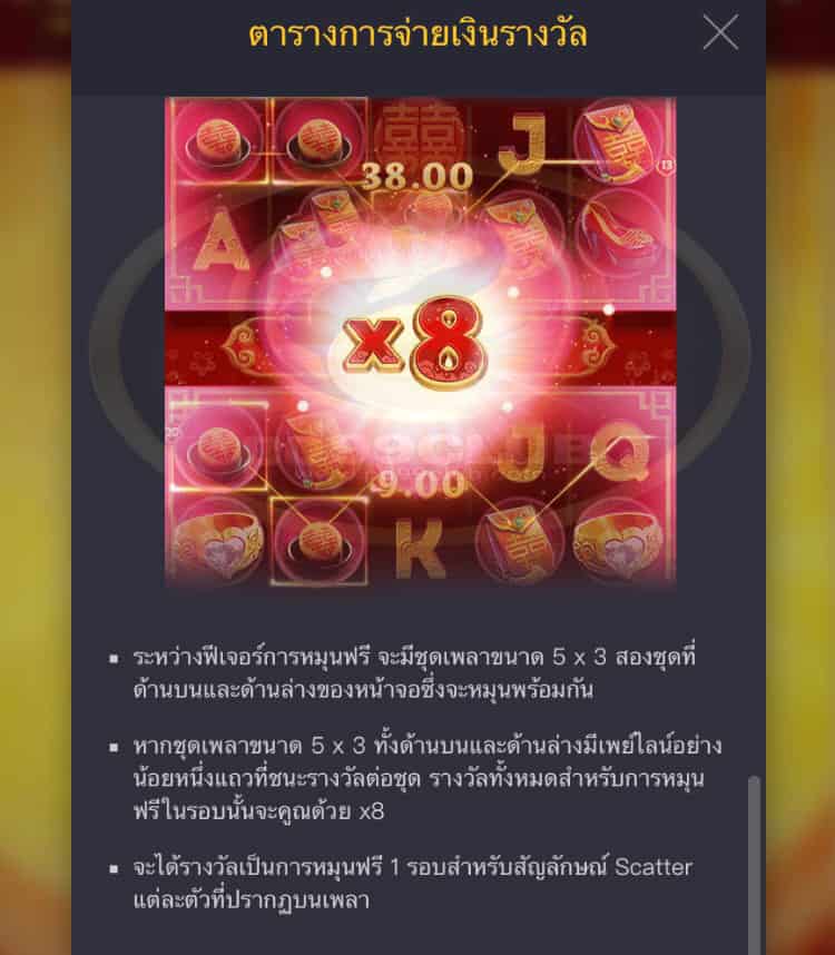 - หากชุดเพลาขนาด 5 x 3 ทั้งด้านบนเเละด้านล่างมีเพย์ไลน์อย่างน้อยหนึ่งแถวที่ชนะรางวัลต่อชุด รางวัลทั้งหมดสำหรับการหมุนฟรีในรอบนั้นจะคูณด้วย x8