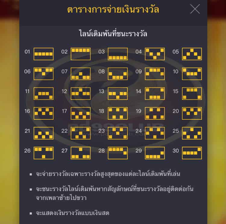 - ไลน์เดิมพันที่ชนะรางวัลมีทั้งใหมด 30 ไลน์เดิมพัน