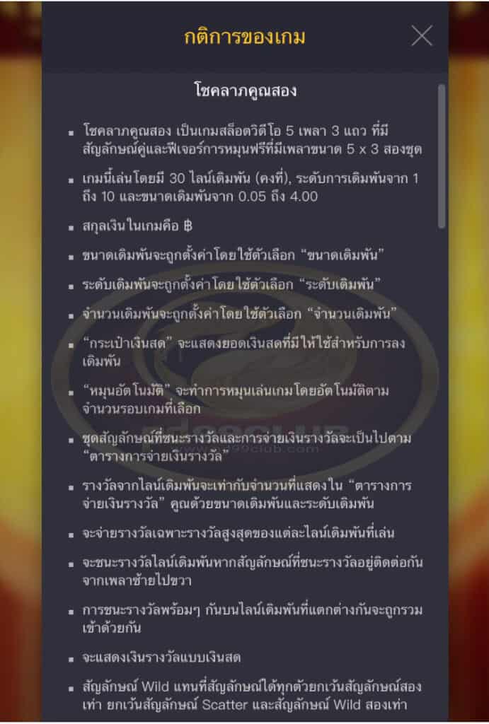 - จะจ่ายรางวัลเฉพาะรางวัลสูงสุดของเเต่ละเพย์ไลน์เดิมพันที่เล่น