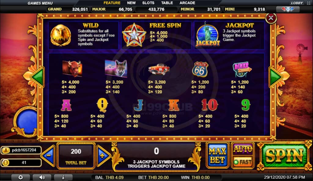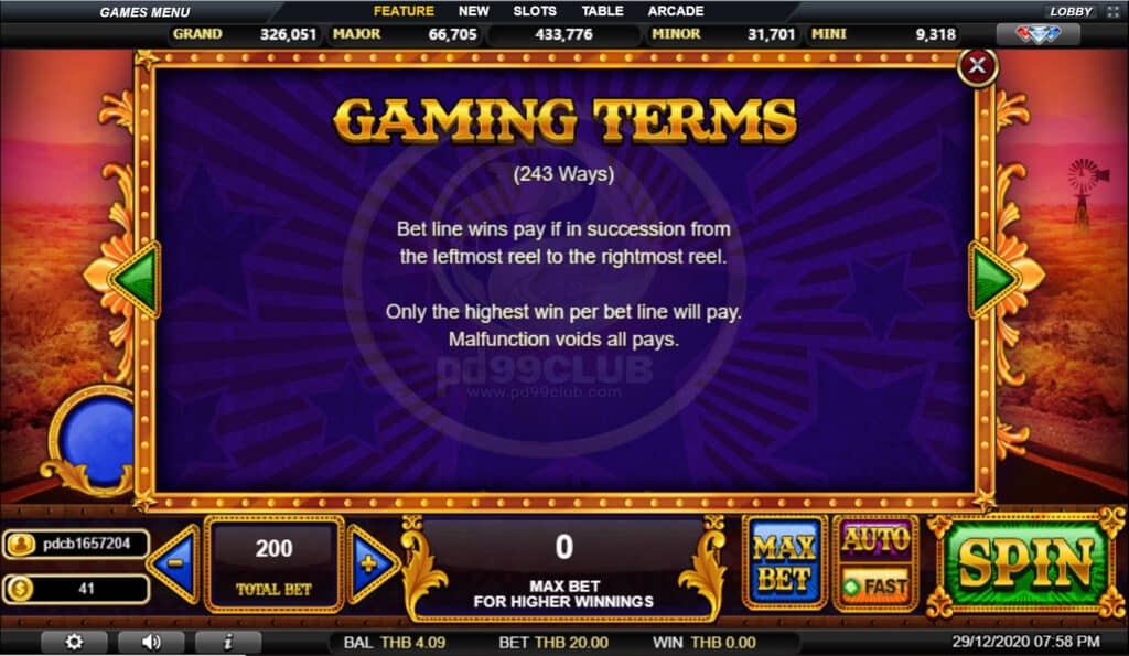 เงื่อนไขการเล่นเกม (243 วิธี) สายการเดิมพันจะได้รับเงินหากต่อเนื่องกันจากรีลซ้ายสุดไปยังรีลขวาสุด เฉพาะผู้ชนะสูงสุดต่อบรรทัดเดิมพันเท่านั้นที่จะจ่าย ความผิดปกติเป็นโมฆะการจ่ายเงินทั้งหมด