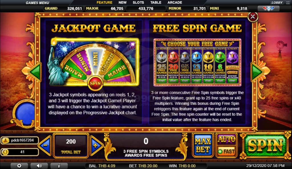 สัญลักษณ์ Free Spin Game ี่ต่อเนื่องกัน 3 ตัวขึ้นไปจะเรียกใช้คุณลักษณะ Free Spin ให้สิทธิ์ฟรีสปินสูงสุด 25 ครั้งหรือตัวคูณ x40 การได้รับโบนัสนี้ระหว่าง Free Spin จะดึงคุณลักษณะนี้อีกครั้งเมื่อสิ้นสุด Free Spin ปัจจุบัน ตัวนับการหมุนฟรีจะถูกรีเซ็ตเป็นค่าเริ่มต้นหลังจากคุณสมบัติสิ้นสุดลง