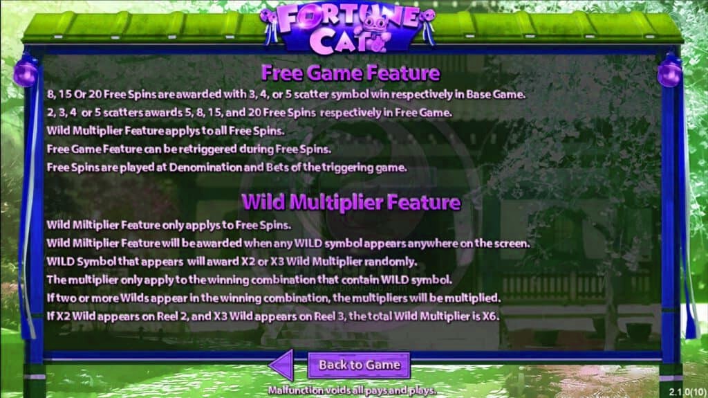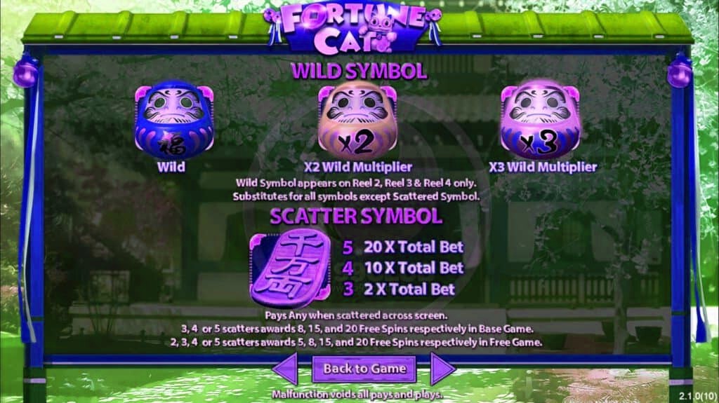 - กระจาย 2 , 3 , 4 หรือ 5 ตัวจะให้ 5 , 8 , 15 หรือ 20 ฟรีสปินตามลำดับในฟรีเกม