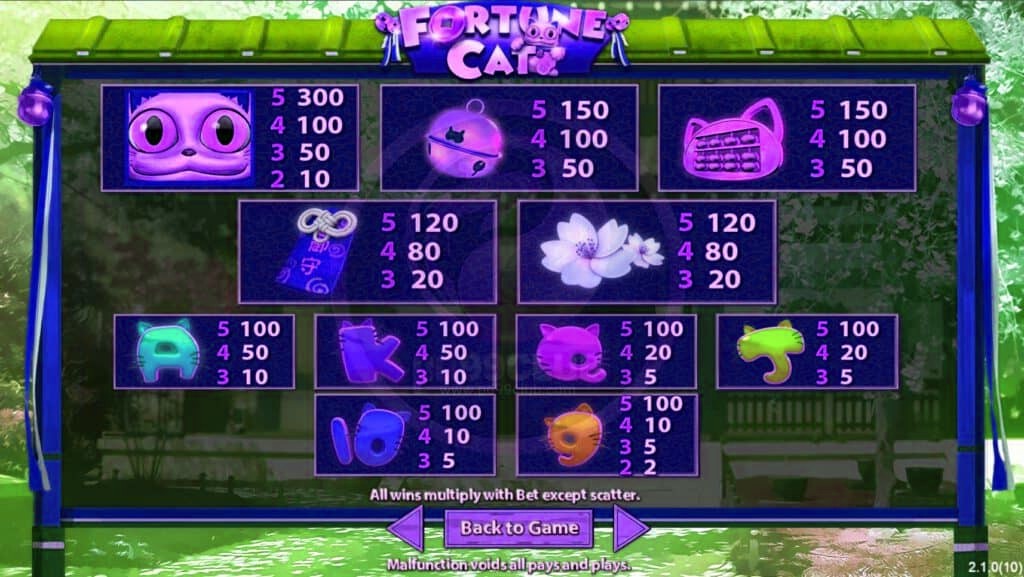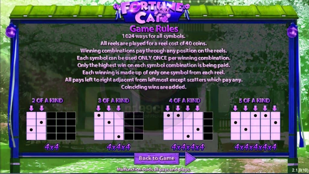 - เเมว : เงินรางวัลตามจำนวนวงล้อ ดังนี้ 5 , 4 , 3 วงล้อ จ่าย 300 , 100 , 10 เหรียญ ตามลำดับ