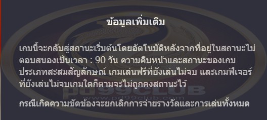 เกมนี้จะกลับสู่สถานะเริ่มต้นโดยอัตโนมัติหลังจากที่อยู่ในสถานะไม่ตอบสนองเป็นเวลา: 90 วันความคืบหน้าและสถานะของเกมประเภทสะสมสัญลักษณ์เกมเล่นฟรีที่ยังเล่นไม่จบและเกมฟีเจอร์ที่ยังเล่นไม่จบเกมใดก็ตามจะไม่ถูกคงสถานะไว้