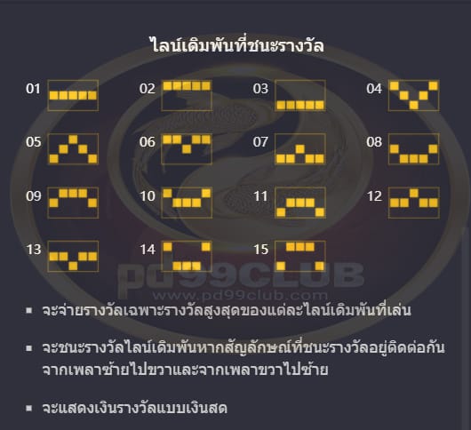 ไลน์เดิมพันที่ชนะรางวัลมีทั้งหมด 15 ไลน์เดิมพัน