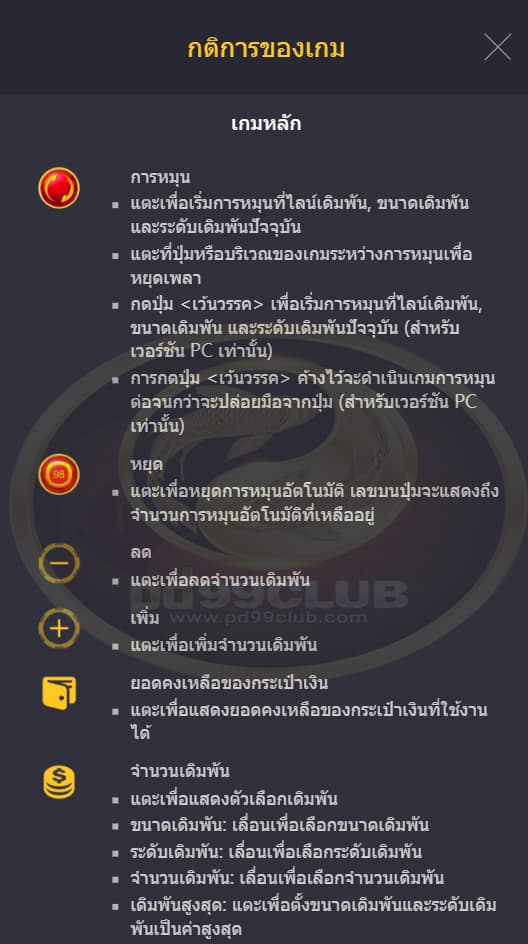 จะเล่นฟีเจอร์การหมุนฟรีด้วยขนาดและระดับเดิมพันเดียวกันกับการหมุนที่เริ่มฟีเจอร์การหมุนฟรีนั้น