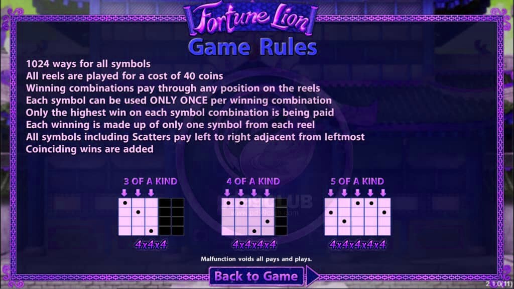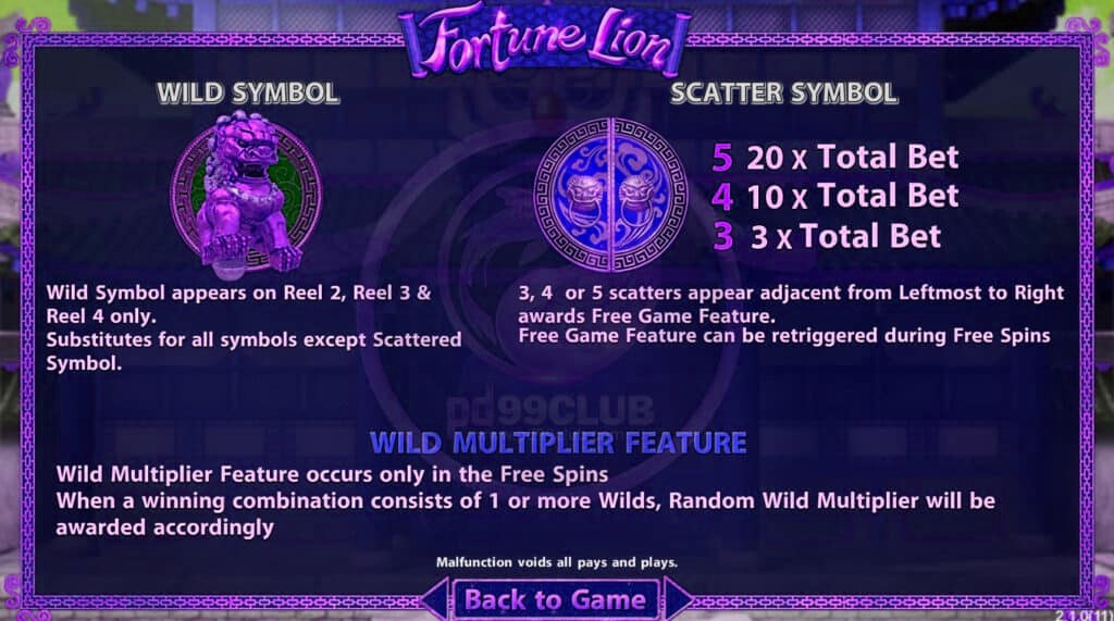 สัญลักษณ์สิงโตเหรียญสีชมพูให้ 10 ฟรีสปิน หากมีมากกว่าหนึ่ง การเเทนที่ในรางวัลจะจ่าย x8 , x10 หรือ x15