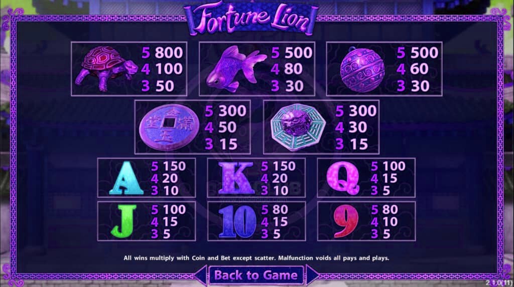 อัตราการจ่ายสัญลักษณ์เต่า ติดกัน 3 ตัว อัตราการจ่ายเงินรางวัลที่คูณ 50 หากออกติดกัน 4 ตัว คูณ 100 หากออกติดกัน 5 ตัวคูณ 800
