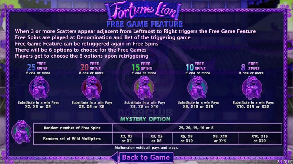 สัญลักษณ์สิงโตเหรียญสีทอง - สัญลักษณ์สิงโตเหรียญสีทองให้ 8 ฟรีสปิน หากมีมากกว่าหนึ่ง การเเทนที่ในรางวัลจะจ่าย x10 , x15 หรือ x20