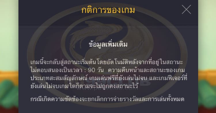 เกมนี้จะกลับสู่สถานะเริ่มต้นโดยอัตโนมัติหลังจากที่อยู่ในสถานะไม่ตอบสนองเป็นเวลา: 90 วันความคืบหน้าและสถานะของเกมประเภทสะสมสัญลักษณ์เกมเล่นฟรีที่ยังเล่นไม่จบและเกมฟีเจอร์ที่ยังเล่นไม่จบเกมใดก็ตามจะไม่ถูกคงสถานะไว้