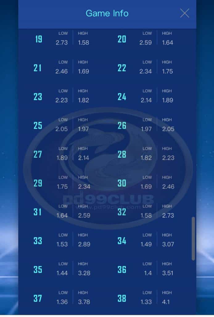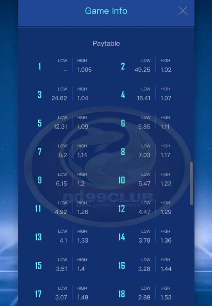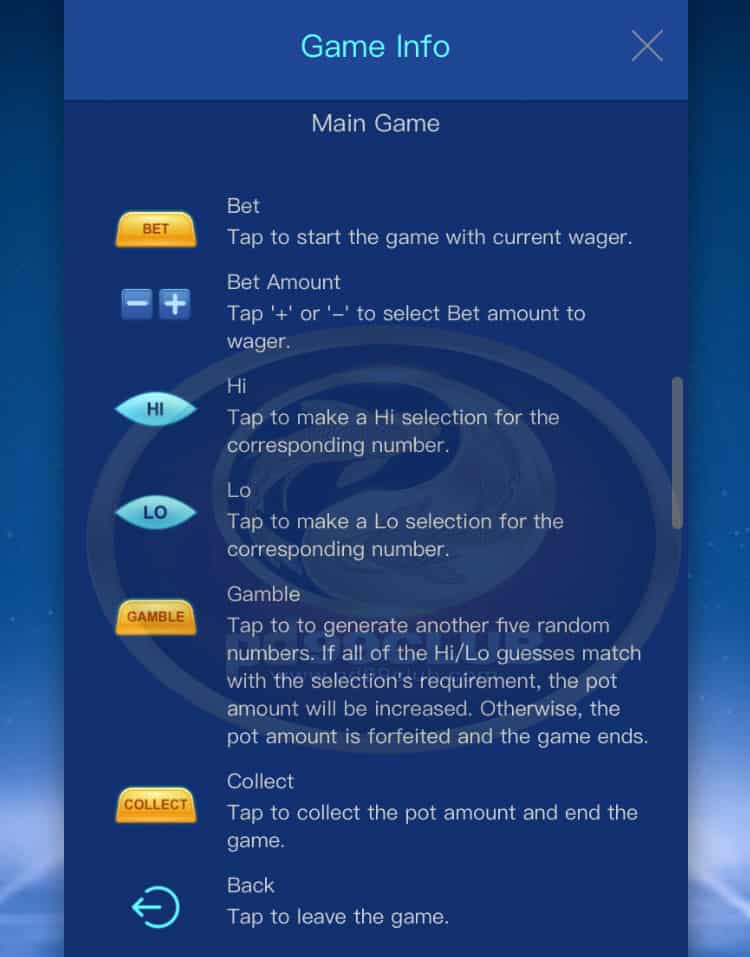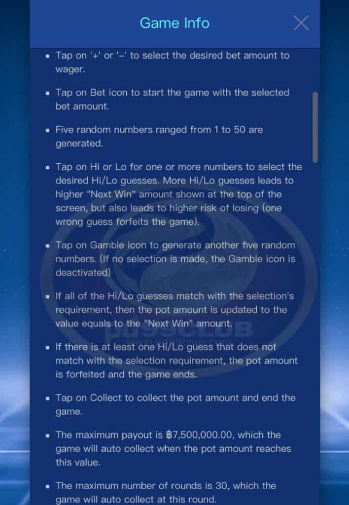 - หากการทายไฮ / โลทั้งหมดตรงกับความต้องการของการเลือกจำนวนเงินกองกลางจะได้รับการอัปเดตเป็นค่าเท่ากับจำนวน “ชนะครั้งต่อไป”