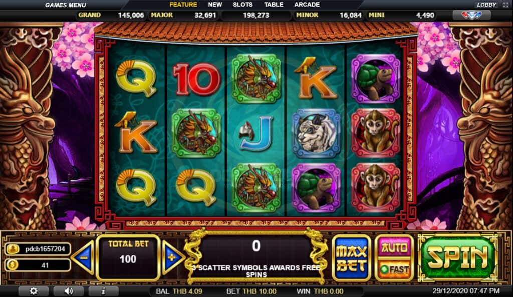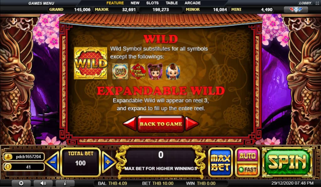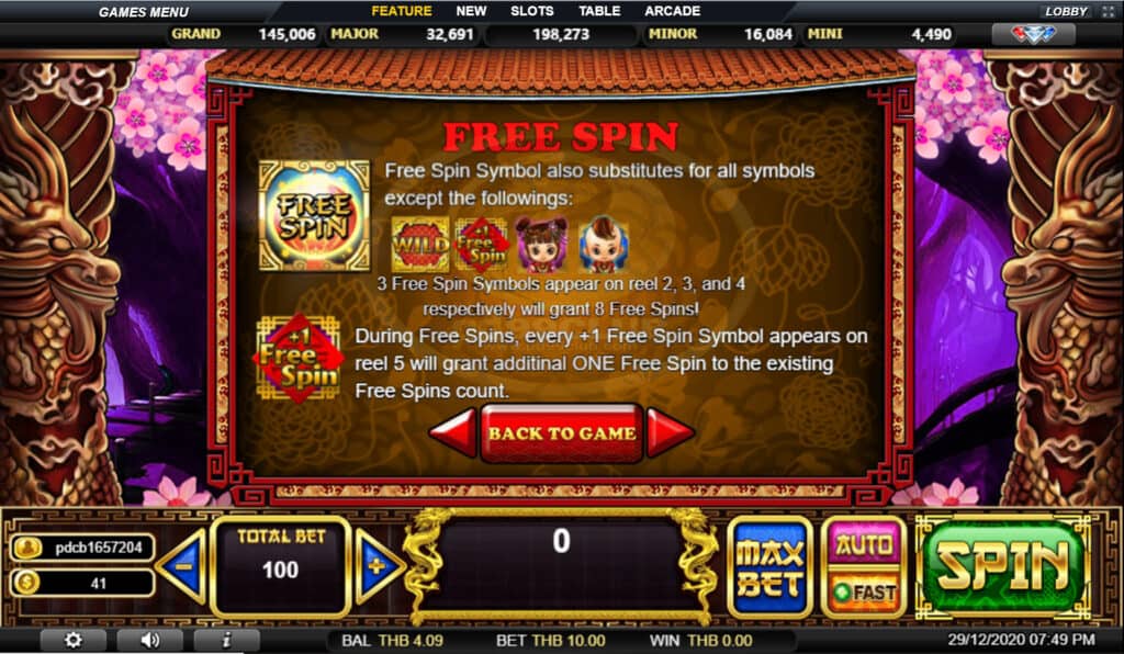 สัญลักษณ์ Free Spin สัญลักษณ์เสริมแทนสัญลักษณ์ทั้งหมดยกเว้นสัญลักษณ์ Wild,Free Spinซองแดง และ Jackpot