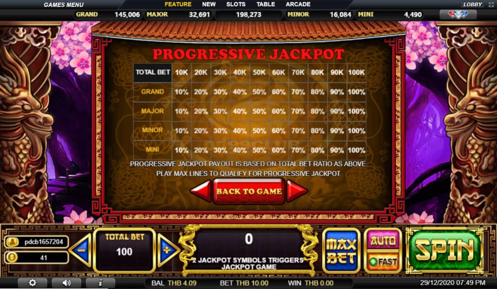 สัญลักษณ์ Progressive Jackpot การจ่ายแจ็คพอตแบบก้าวหน้าขึ้นอยู่กับอัตราส่วนการเดิมพันทั้งหมดข้างต้นเล่นเส้นสูงสุดเพื่อให้มีคุณสมบัติเหมาะสมสำหรับแจ็คพอตที่ก้าวหน้า