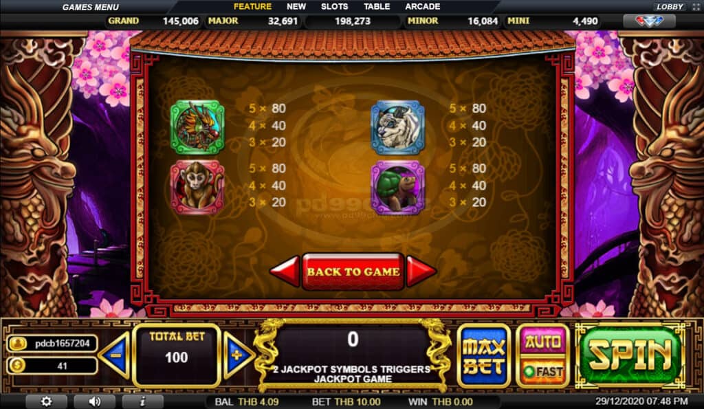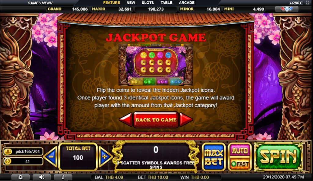 สัญลักษณ์ Jackpot Game พลิกเหรียญเพื่อเปิดเผยไอคอนแจ็คพอตที่ซ่อนอยู่ เมื่อผู้เล่นพบไอคอนแจ็คพอตที่เหมือนกัน 3 ไอคอนเกมจะมอบรางวัลให้กับผู้เล่นด้วยจำนวนจากหมวดแจ็คพอตนั้น!