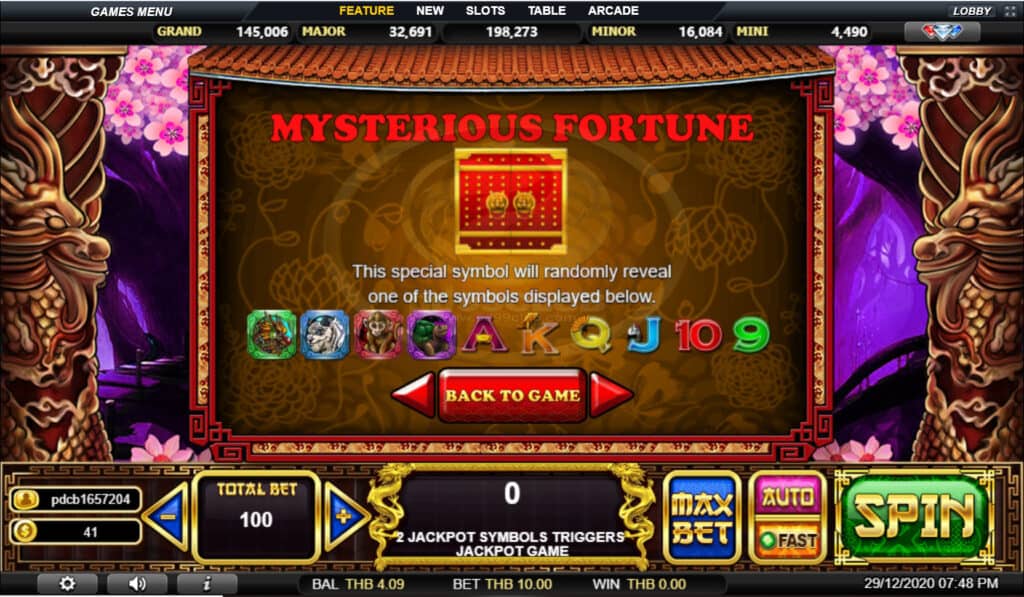 สัญลักษณ์ Mysterious Fortune สัญลักษณ์พิเศษนี้จะสุ่มแสดงหนึ่งในสัญลักษณ์ที่แสดงด้านล่าง
