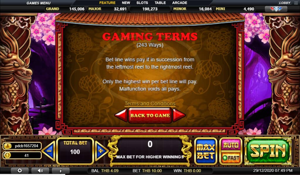 เงื่อนไขการเล่นเกม (243 วิธี) สายการเดิมพันจะได้รับเงินหากต่อเนื่องกันจากรีลซ้ายสุดไปยังรีลขวาสุด เฉพาะผู้ชนะสูงสุดต่อบรรทัดเดิมพันเท่านั้นที่จะจ่าย ความผิดปกติเป็นโมฆะการจ่ายเงินทั้งหมด
