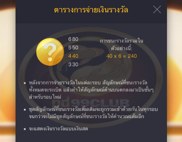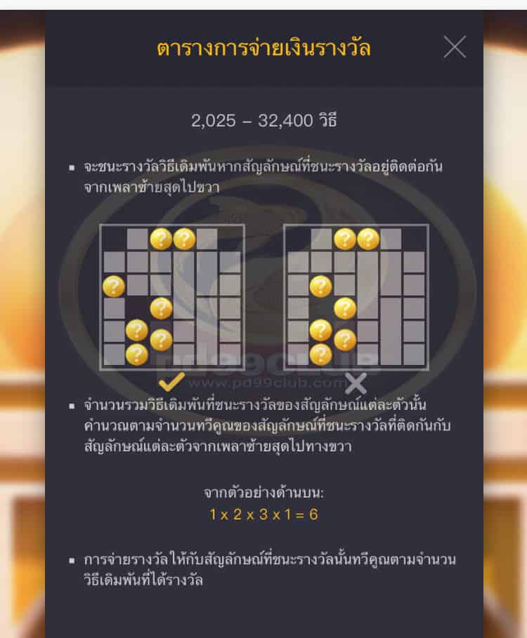 - การจ่ายรางวัลให้กับสัญลักษณ์ที่ชนะรางวัลนั้นทวีคูณตามจำนวนวิธีเดิมพันที่ได้รางวัล
