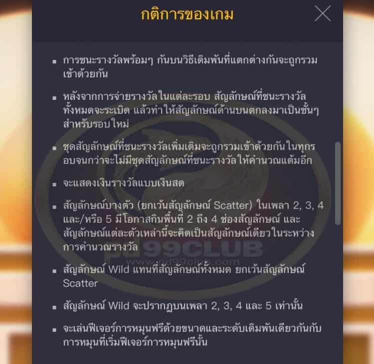 - จะเล่นฟีเจอร์การหมุนฟรีด้วยขนาดและระดับเดิมพันเดียวกันกับการหมุนที่เริ่มฟีเจอร์การหมุนฟรีนั้น