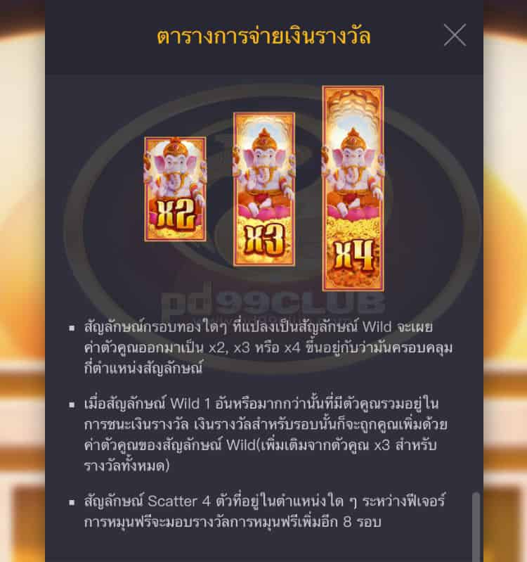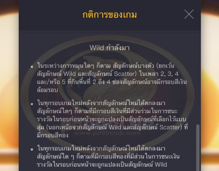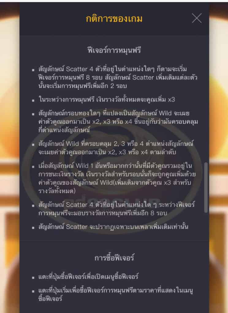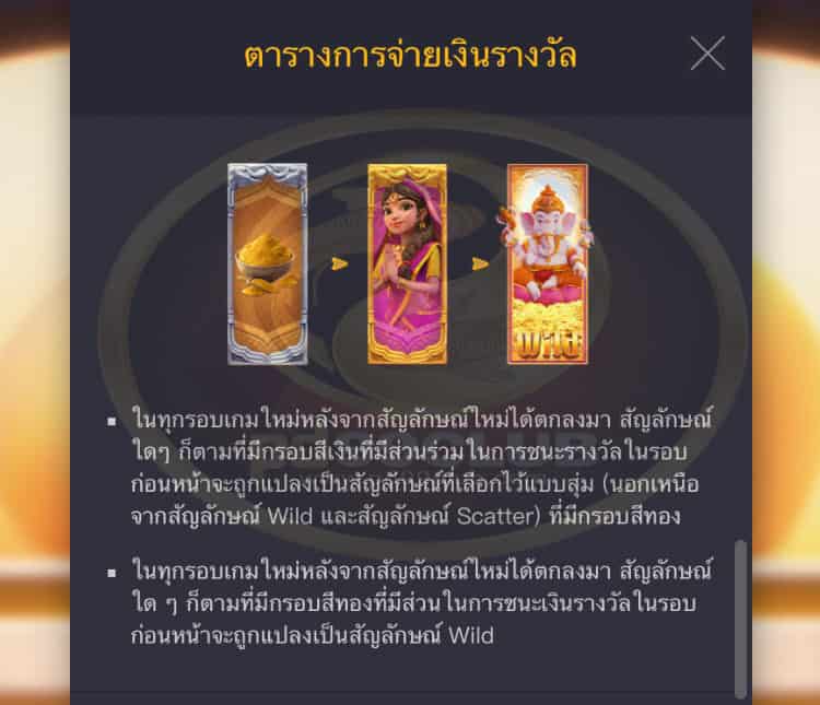- สัญลักษณ์กรอบทองใดๆที่แปลงเป็นสัญลักษณ์ Wild จะเผยค่าตัวคูณออกมาเป็น x2,x3,x4 ขึ้นอยู่กับว่ามันครอบคลุมกี่ตำแหน่งสัญลักษณ์