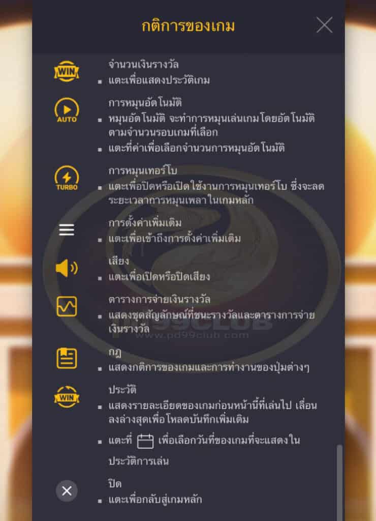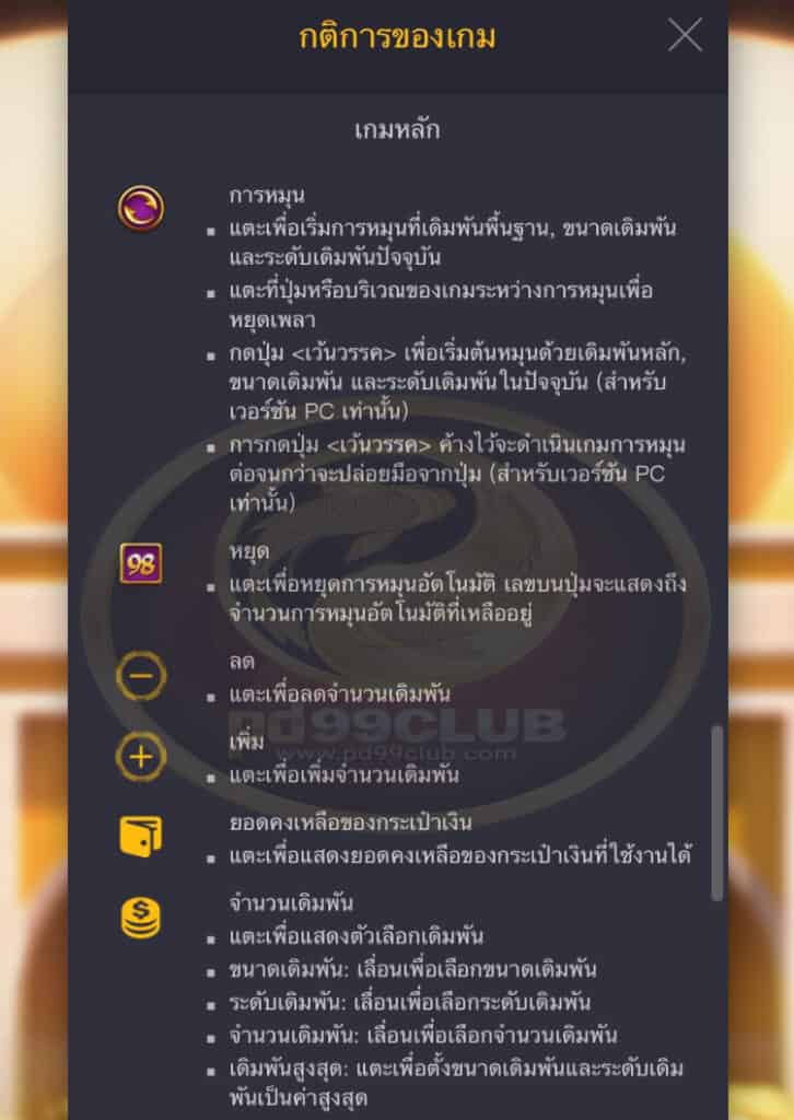 - หมุนอัตโนมัติจะทำการหมุนเล่นเกมโดยอัตโนมัติตามจำนวนรอบเกมที่เลือก