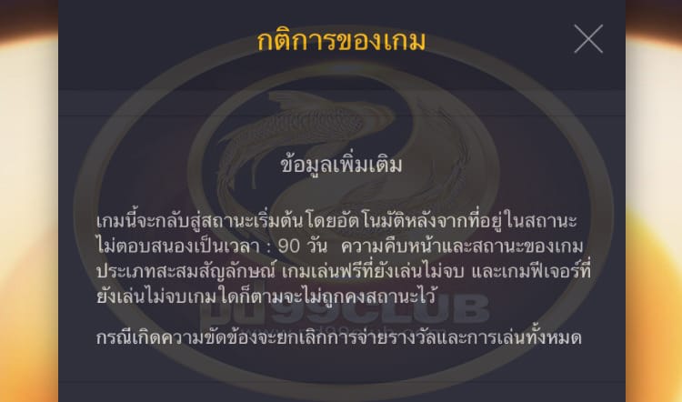 - เกมนี้จะกลับสู่สถานะเริ่มต้นโดยอัตโนมัติหลังจากที่อยู่ในสถานะไม่ตอบสนองเป็นเวลา: 90 วันความคืบหน้าและสถานะของเกมประเภทสะสมสัญลักษณ์เกมเล่นฟรีที่ยังเล่นไม่จบและเกมฟีเจอร์ที่ยังเล่นไม่จบเกมใดก็ตามจะไม่ถูกคงสถานะไว้