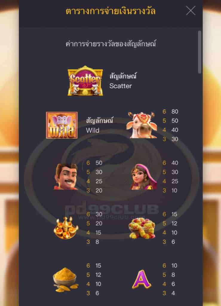 - ค่าการจ่ายรางวัลของสัญลักษณ์มีทั้งหมด 13 สัญลักษณ์
