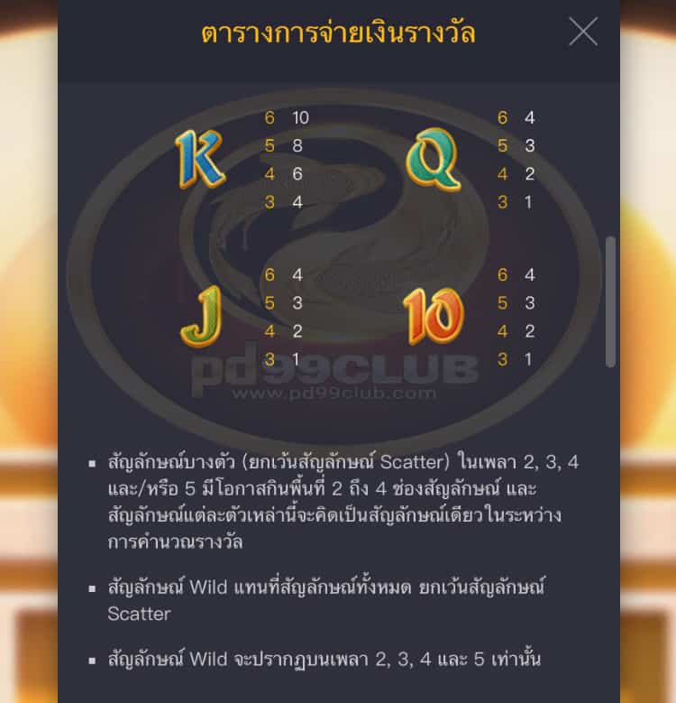 - สัญลักษณ์ Wild แทนที่สัญลักษณ์ทั้งหมดยกเว้นสัญลักษณ์ Scatter