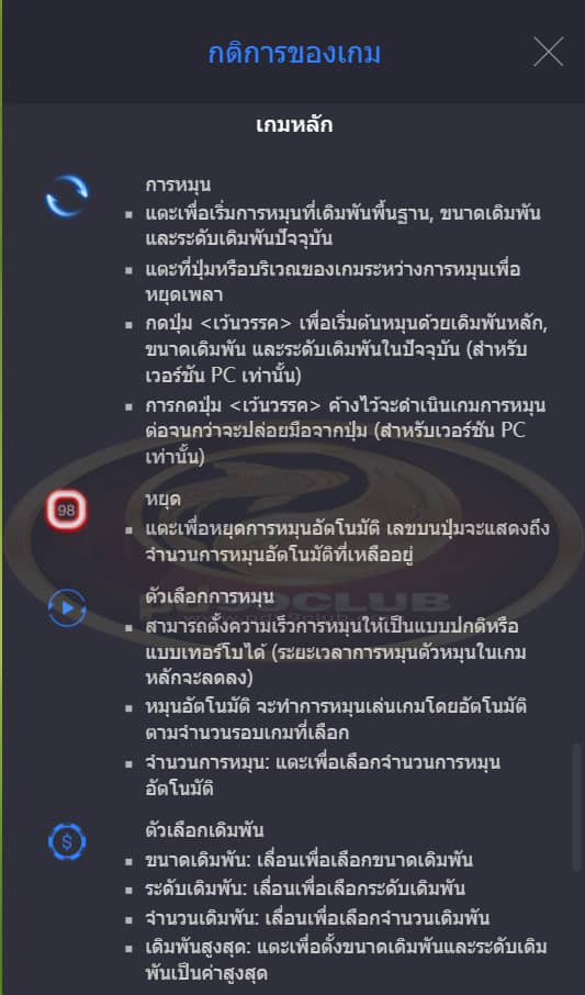 “ หมุนอัตโนมัติ” จะทำการหมุนเล่นเกมโดยอัตโนมัติตามจำนวนรอบเกมที่เลือก