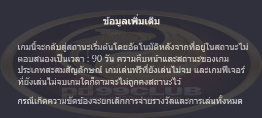 เกมนี้จะกลับสู่สถานะเริ่มต้นโดยอัตโนมัติหลังจากที่อยู่ในสถานะไม่ตอบสนองเป็นเวลา: 90 วันความคืบหน้าและสถานะของเกมประเภทสะสมสัญลักษณ์เกมเล่นฟรีที่ยังเล่นไม่จบและเกมฟีเจอร์ที่ยังเล่นไม่จบเกมใดก็ตามจะไม่ถูกคงสถานะไว้