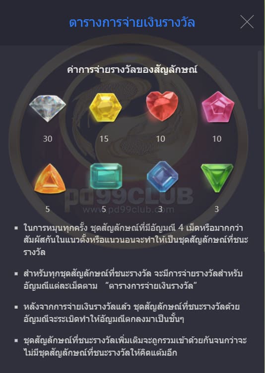สำหรับชุดสัญลักษณ์ที่ชนะรางวัล จะมีการจ่ายรางวัลสำหรับอัญมณีเเต่ละเม็ดตาม “ ตารางการจ่ายเงินรางวัล”