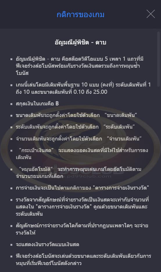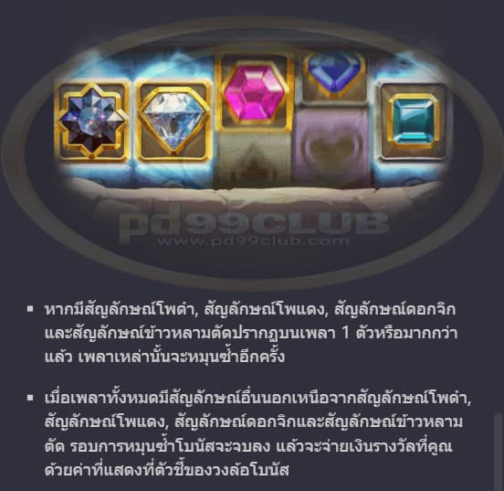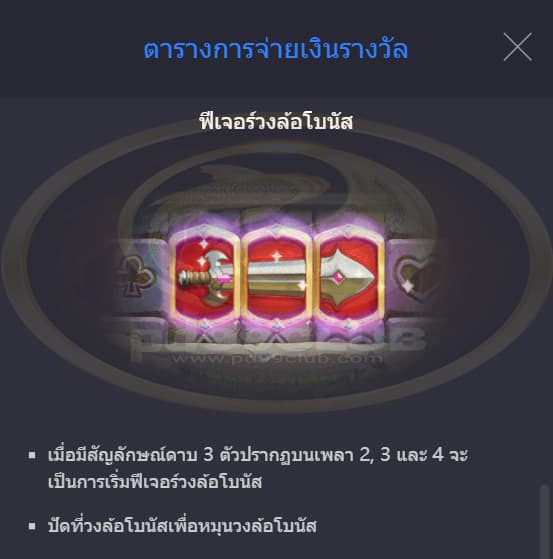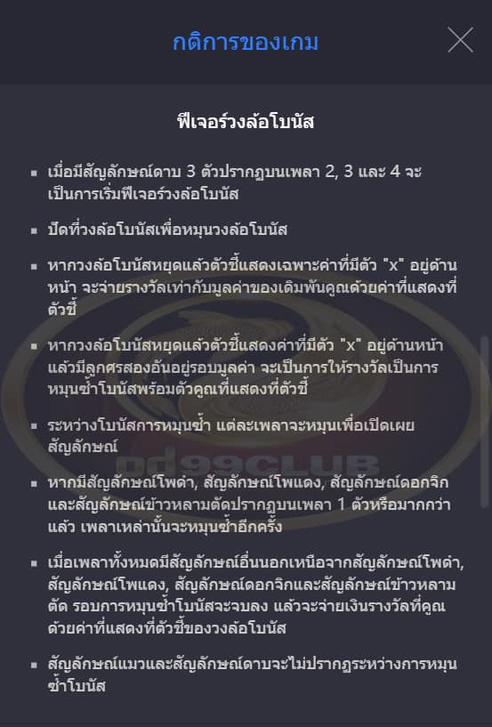- ฟีเจอร์วงล้อโบนัสจะเล่นด้วยขนาดเเละระดับเดิมพันเดียวกับการหมุนที่เริ่มฟีเจอร์โบนัสดังกล่าว