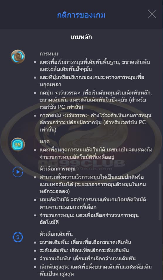- “ หมุนอัตโนมัติ ” จะทำการหมุนเล่นเกมโดยอัตโนมัติตามจำนวนรอบเกมที่เลือก